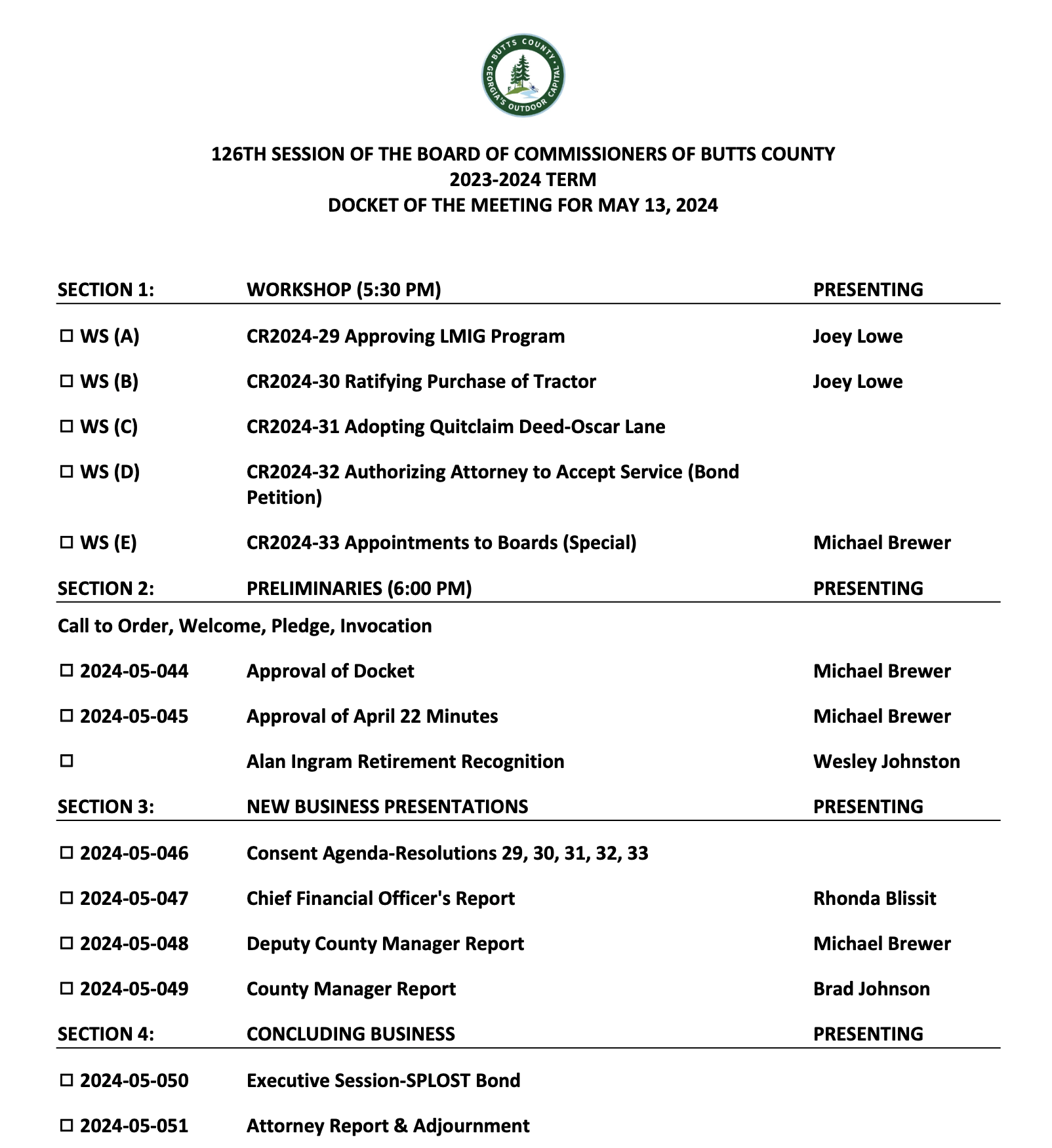 The docket of the May 13, 2024 Board of Commissioners Meeting is closed and is published below: