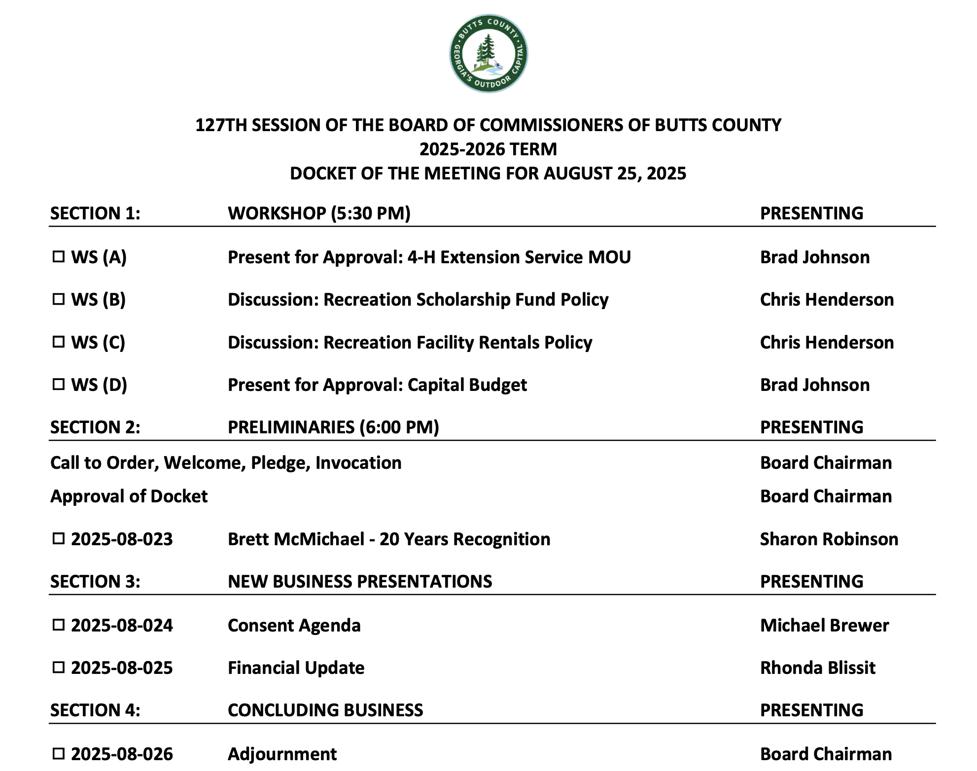 By: mbrewer Date: Aug 21, 2025 Comment: 0 Category: Agendas and Minutes The docket for the August 25, 2025 Board of Commissioners meeting is published below: