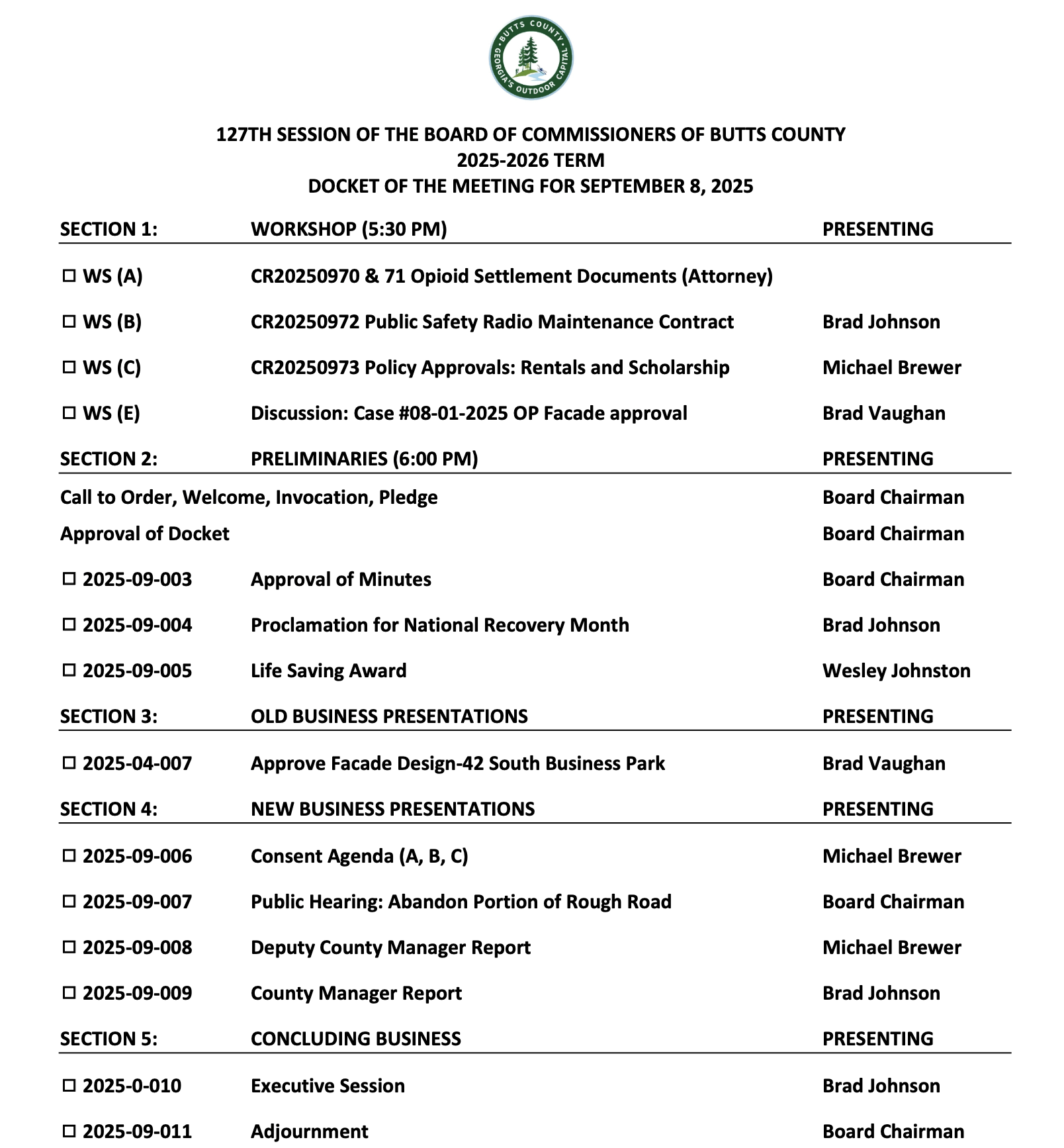 The docket for the September 8, 2025 Board of Commissioners meeting is published below: