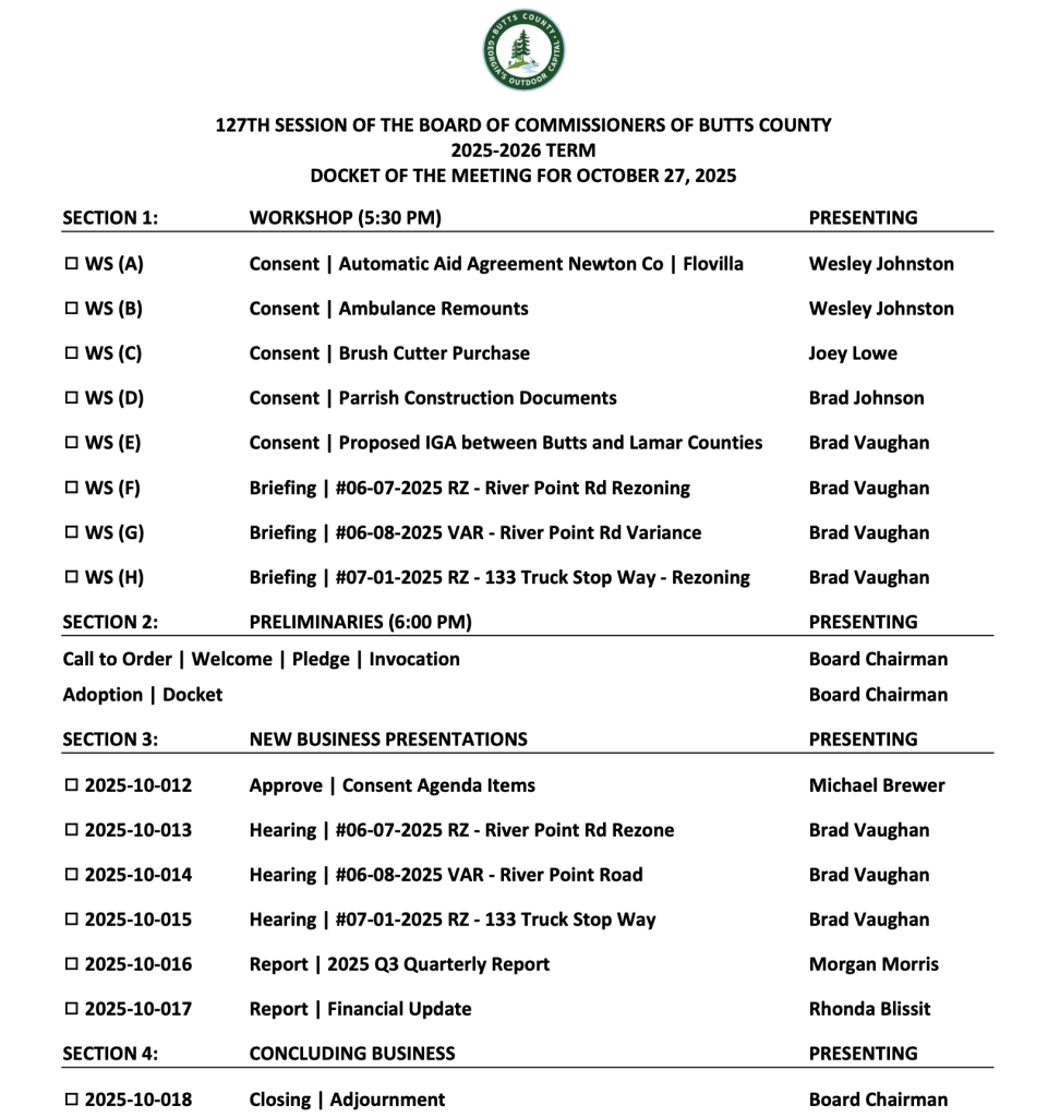 The docket for the October 27, 2025 Board of Commissioners Workshop and Meeting is published below: